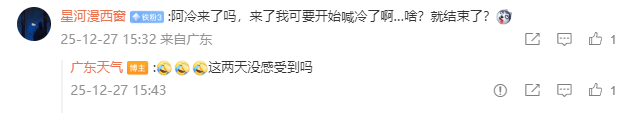 对此,@广东天气“回应”道:虽然白天气温回升,但早晚依然能感受到凉意,“昼暖夜凉”将成为这几天的天气主调——白天的暖阳让人仿佛回到初秋,清晨傍晚的凉风又提醒着冬日的存在。