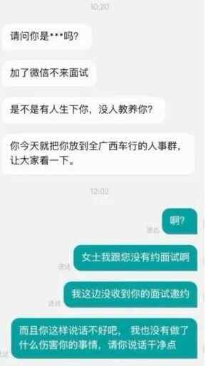 据该网友发布的聊天记录显示,公司人事质问:“加了微信,不来面试,是不是有人生下你,没有人教养你?今天就把你放到全广西车行的人事群,让大家看一下。”