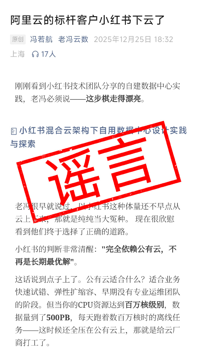 最近,有博主发布消息称,阿里云的标杆客户小红书下云了,对此,阿里云的官方微博在12月25日夜间回应,该信息为谣言。