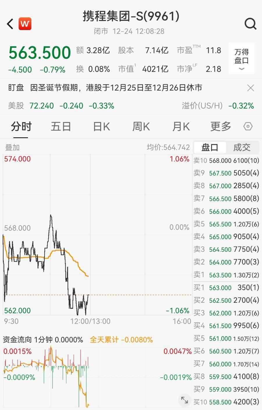 因圣诞节假期,港股今日闭市。截至12月24日收盘,携程集团报563.5港元/股,总市值为4021亿港元,年内涨4.88%。