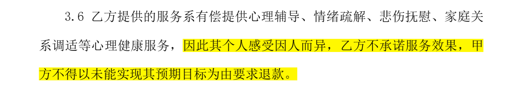 在小张提供的合同中,记者看到有条款规定:“乙方(情感机构)不承诺服务效果,甲方(客户)不得以未能实现其预期目标为由要求退款。”