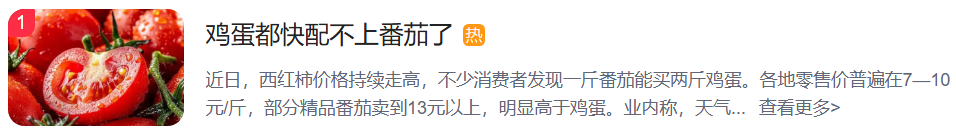 据了解,当前全国多地西红柿零售价飙升至7-10元/斤,部分精品价格突破13元,而它的老搭档——鸡蛋均价只有3-6元/斤。