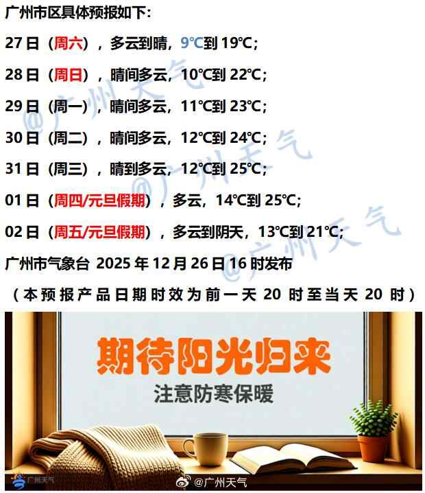 广州方面,期待阳光,未来几天云渐少,早晚温差重新变大。注意适时添减衣物,晾晒预备备!天气干燥,记得多喝水,同时注意用火用电安全。