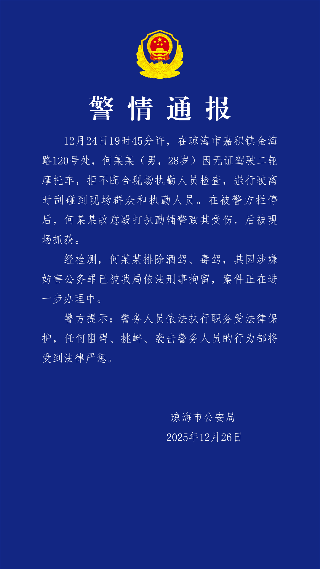 12月24日19时45分许,在琼海市嘉积镇金海路120号处,何某某(男,28岁)因无证驾驶二轮摩托车,拒不配合现场执勤人员检查,强行驶离时刮碰到现场群众和执勤人员。在被警方拦停后,何某某故意殴打执勤辅警致其受伤,后被现场抓获。