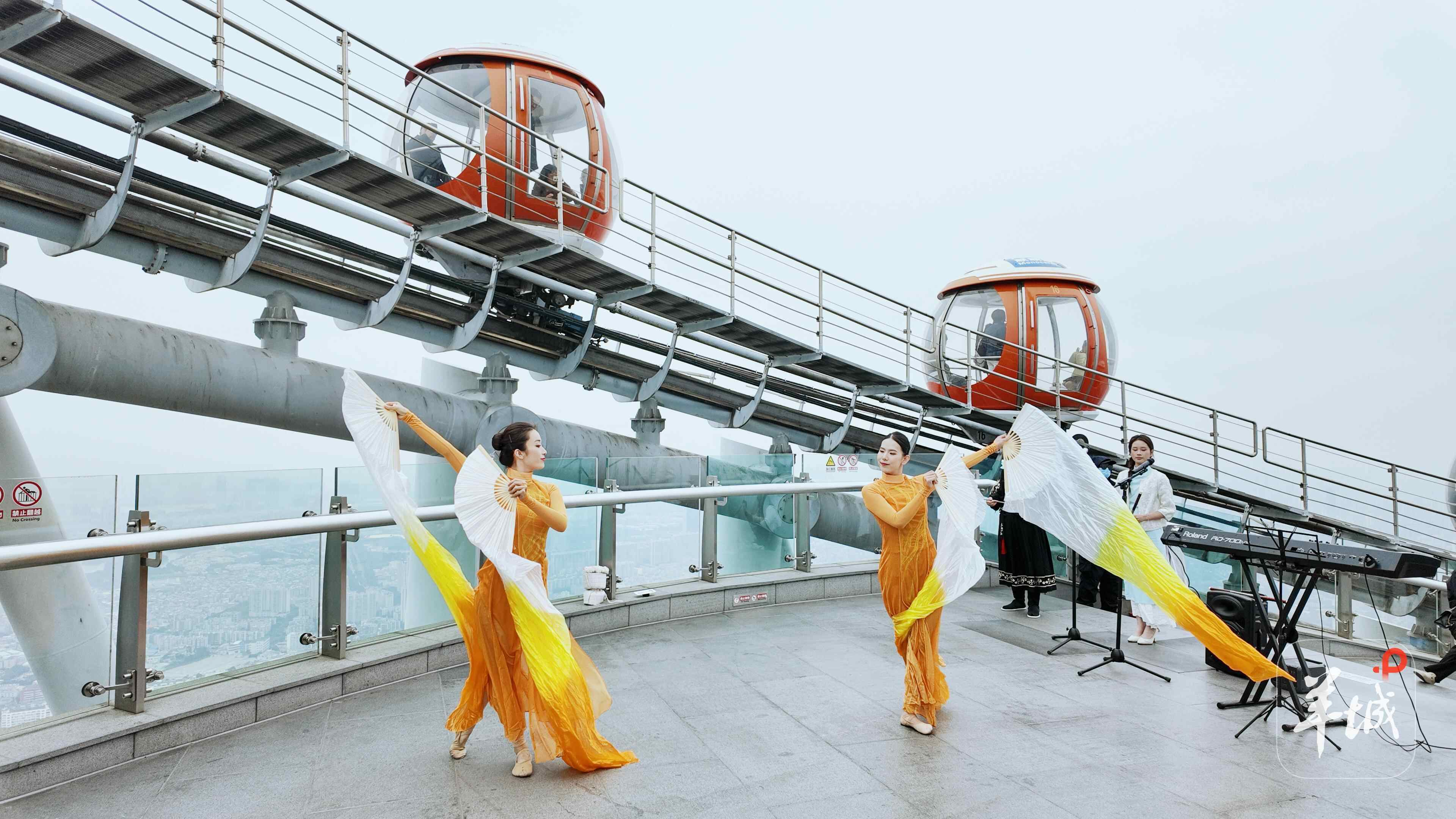 12月26日,2026广州塔新年艺术季系列活动迎来新一轮高潮,广州塔携手南方歌舞团在450米户外观景平台倾情演绎歌舞艺术展演。
