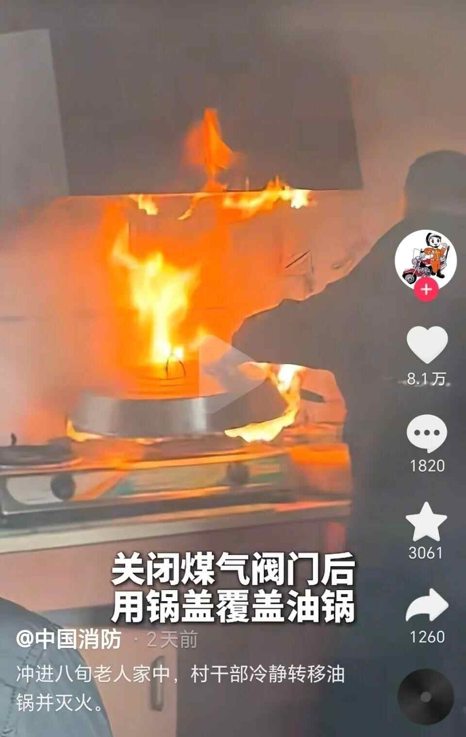 据中国消防,近日,浙江湖州一村民家中油锅起火,路过的村干部冲进现场灭火,化险为夷。关闭煤气阀门、用锅盖覆盖油锅、关掉总电闸、将着火的锅转移至户外,这一系列被网民称为“教科书级操作”。