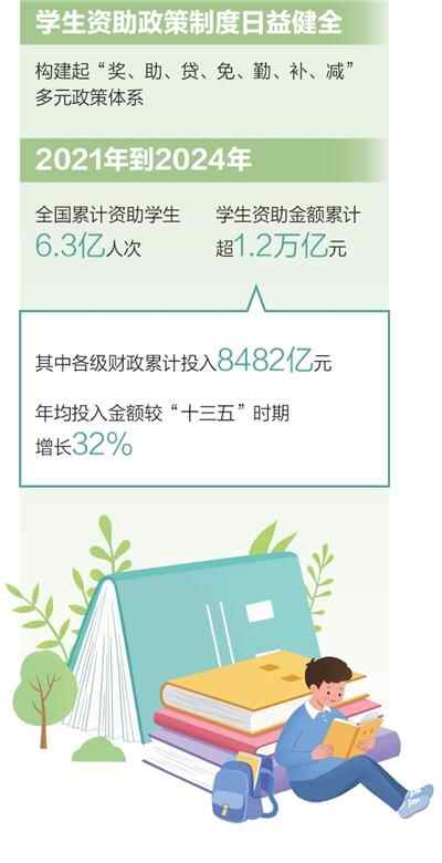 近年来,国家资助政策经历了多次调整完善。一方面,资助范围进一步扩大。本专科生国家奖学金、研究生国家奖学金奖励名额分别翻倍至12万名、9万名;今年春季学期起,符合条件的中等职业学校三年级学生,首次纳入国家助学金资助范围。另一方面,资助标准进一步提升。目前,本专科生国家奖学金奖励标准提高到1万元,国家励志奖学金标准提至6000元,本专科生国家助学金平均资助标准提至3700元,普通高中、中等职业教育国家助学金平均资助标准提至2300元。