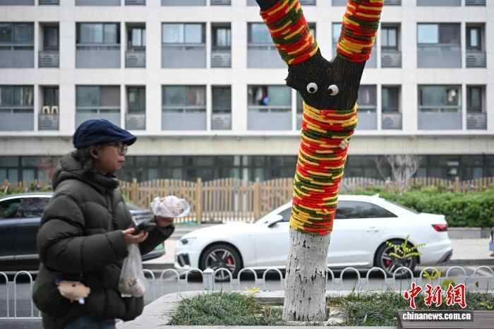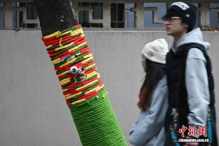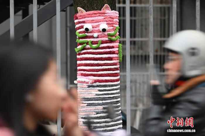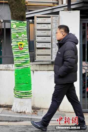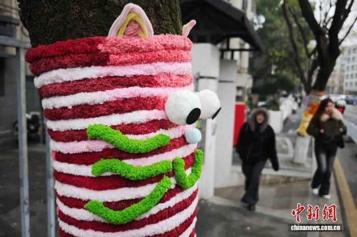 12月24日,南京市鼓楼区一道路上,树身“穿”上彩色毛衣搭配卡通表情,不仅扮靓了街巷,也为老城烟火增添了一份俏皮的暖意。中新社记者 泱波 摄