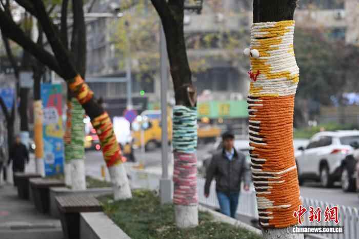 12月24日,南京市鼓楼区一道路上,树身“穿”上彩色毛衣搭配卡通表情,不仅扮靓了街巷,也为老城烟火增添了一份俏皮的暖意。中新社记者 泱波 摄