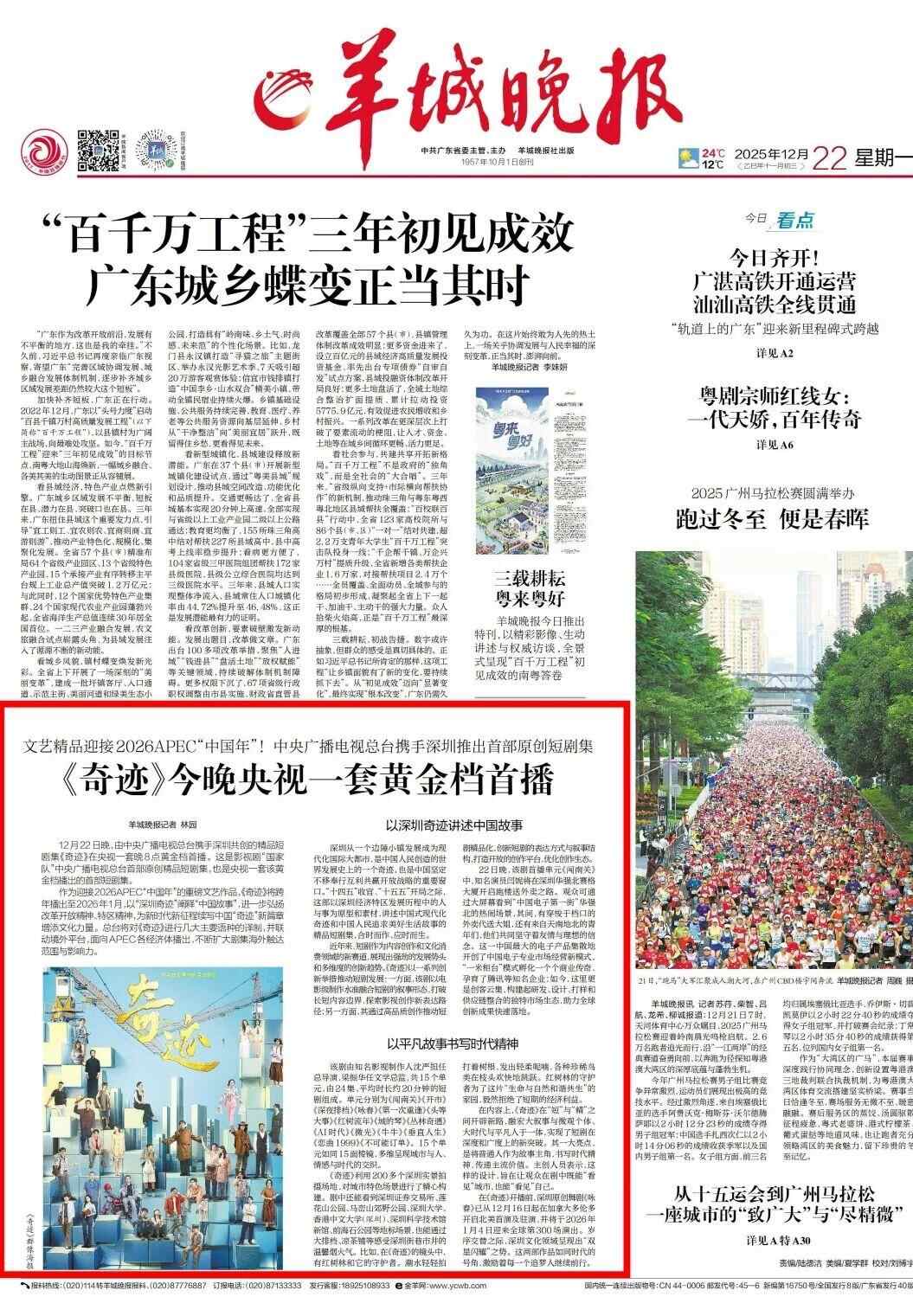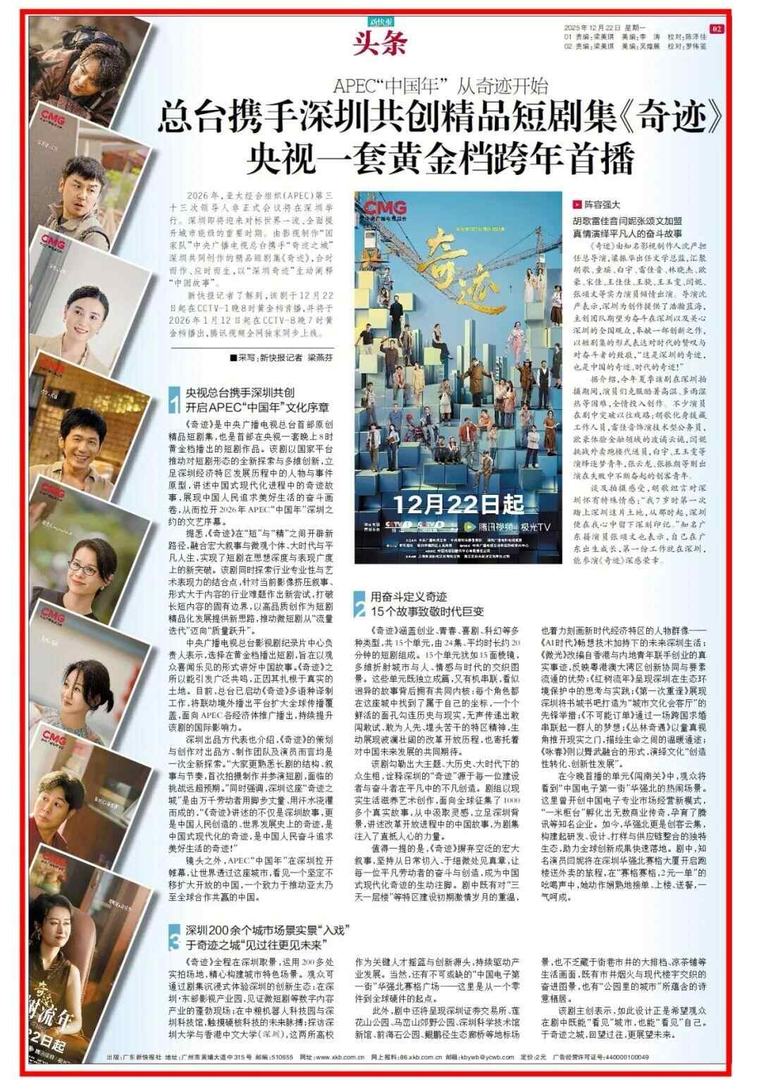 此外,2025年是深圳经济特区成立45周年。《奇迹》用短小精悍的短剧集形式,回溯深圳45年来从小渔村到国际化都市的发展巨变。2026年,亚太经合组织(APEC)第三十三次领导人非正式会议将在深圳举行,这部以深圳经济特区发展历程中的人与事为原型和素材、讲述中国式现代化奇迹和中国人民追求美好生活故事的精品短剧集,也将开启2026APEC中国年“深圳之约”的文艺序章。
