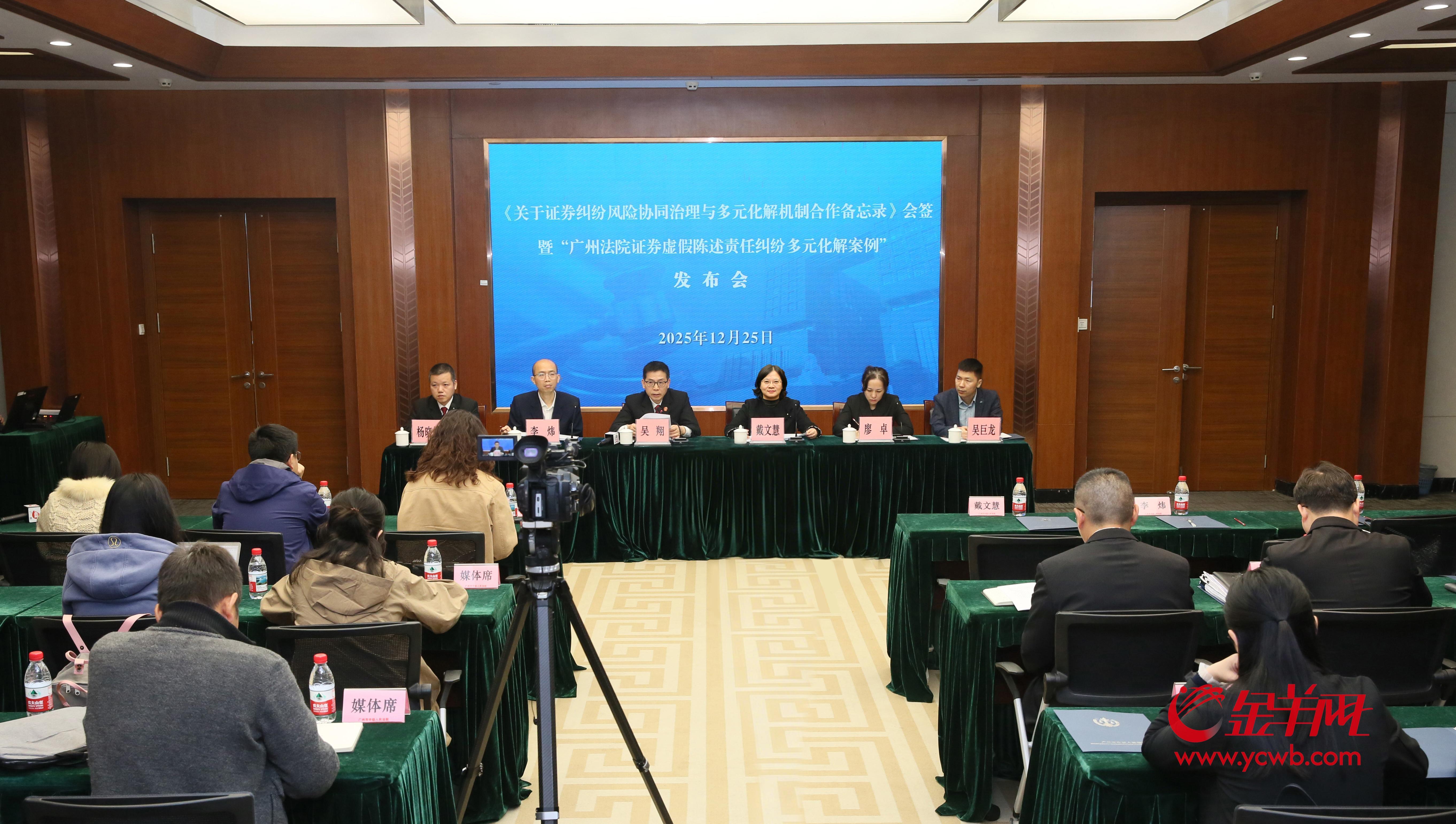 12月25日,广州市中级人民法院(以下简称广州中院)、中国证券监督管理委员会广东监管局(以下简称广东证监局)、广东中证投资者服务与纠纷调解中心(以下简称调解中心)联合举办《关于证券纠纷风险协同治理与多元化解机制合作备忘录》会签暨“广州法院证券虚假陈述责任纠纷多元化解案例”发布会。广州中院党组副书记、副院长吴翔,广东证监局党委委员、副局长戴文慧参加。