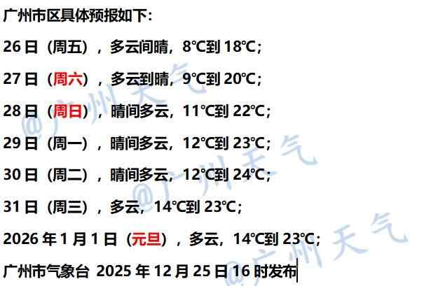 然后下一场明显冷空气会在元旦假期后期影响广东。预计2026年1月3日,受中等偏强冷空气影响,广州阴天到多云,气温又会明显下降。