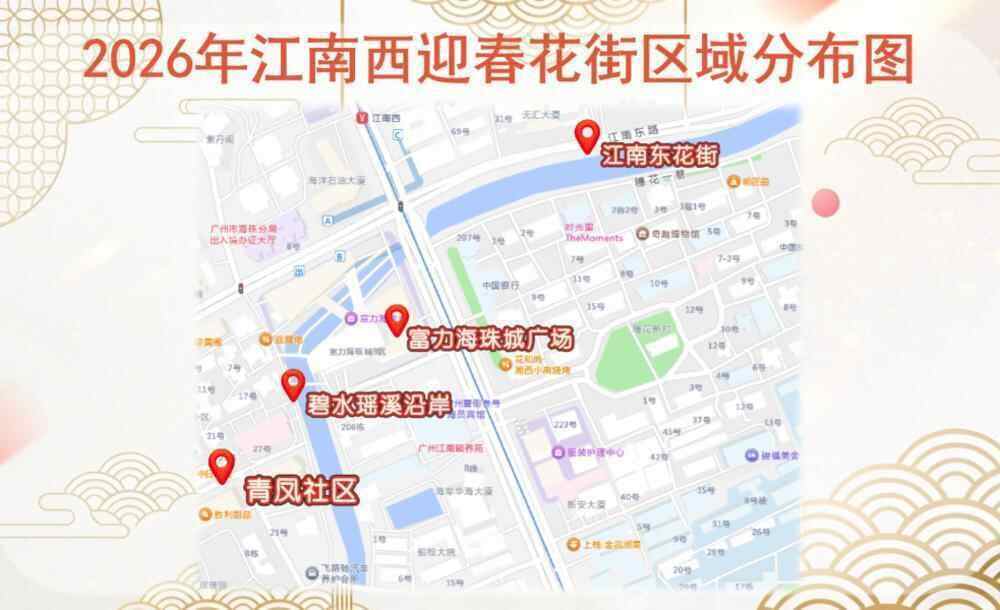 水网密集的海珠区,不少街区伴随河涌建设。此前公布有关安排的琶洲花市沿黄埔涌布置。相比东部的黄埔涌,更经典的马涌则流经海珠的中西部。从25日发布的官方预告看,2026年江南西“迎春花街”,将分别布局于江南东花街、富力海珠城广场、碧水瑶溪沿岸、青凤社区等马涌沿岸区域。按现有安排,江南西“迎春花街”将在2026年2月6日至14日期间设置,共设置9天。