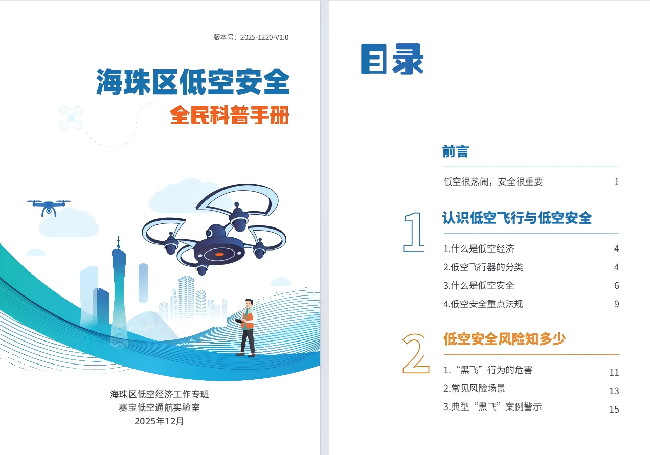 随着无人机航拍、巡检、配送、文旅表演等低空活动日益普及,低空飞行已从少数人的爱好逐步成为更多人的日常。12月25日,在广州举行的低空安全与科技创新专题报告会上,《海珠区低空安全全民科普手册》(下称“手册”)正式发布。