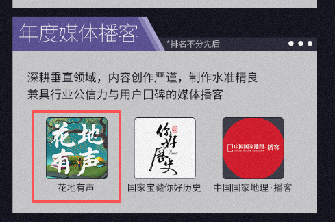“年度媒体播客”授予“深耕垂直领域,内容创作严谨,制作水准精良,兼具行业公信力与用户口碑的媒体播客”。本次获评“年度媒体播客”的,还有“中国国家地理博客”和央视出品的“国家宝藏你好历史”两家国家级别媒体。