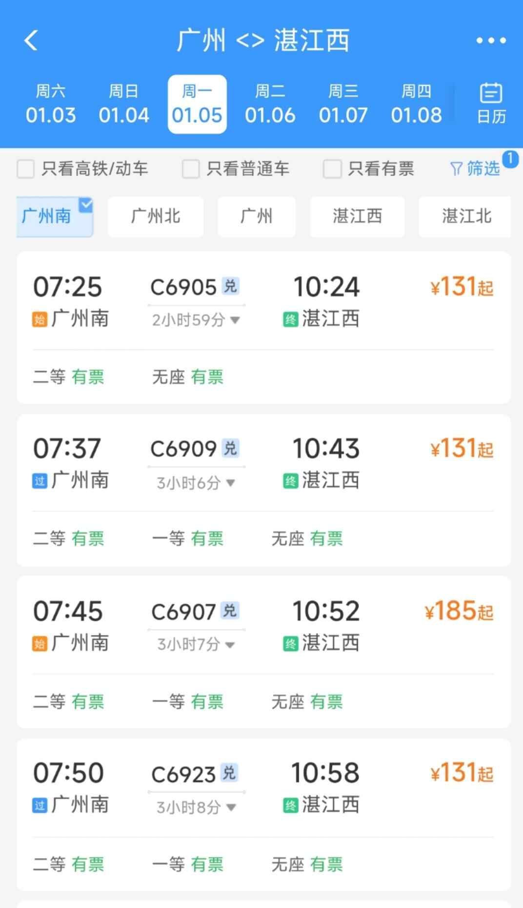 记者查询12306APP,1月5日起,湛江西往返广州南动车组列车车次多档优惠票价上线,票价最低为131元,为两地群众出行、商务往来及产业协作提供便利。