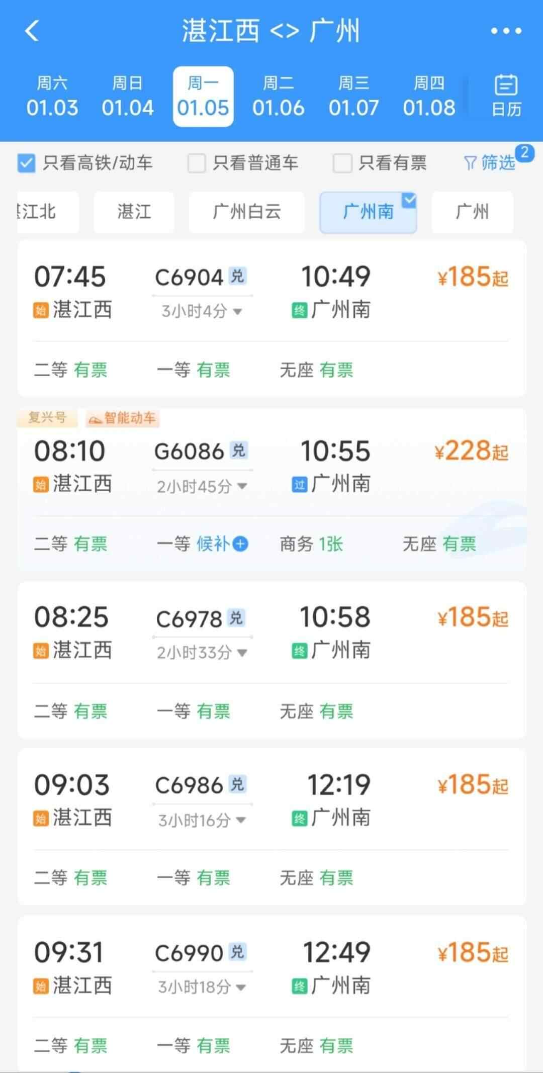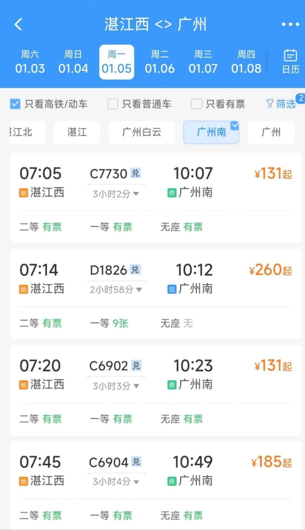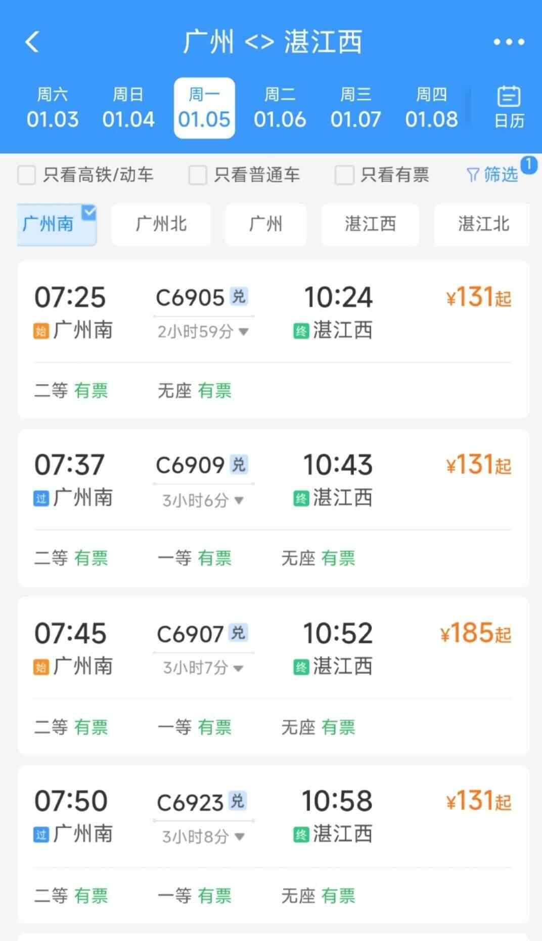 记者查询12306APP,1月5日起,湛江西往返广州南动车组列车车次多档优惠票价上线,票价最低为131元,为两地群众出行、商务往来及产业协作提供便利。