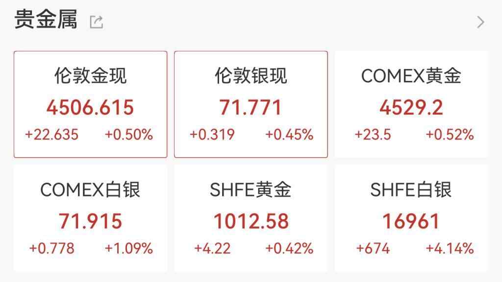 12月23日,现货黄金盘中再创历史新高,逼近4500美元/盎司。现货白银首次突破70美元/盎司。国际贵金属期货普遍上涨,COMEX黄金期货收涨1.02%,报4515美元/盎司,创历史新高;COMEX白银期货收涨4.44%,报71.61美元/盎司,创历史新高。