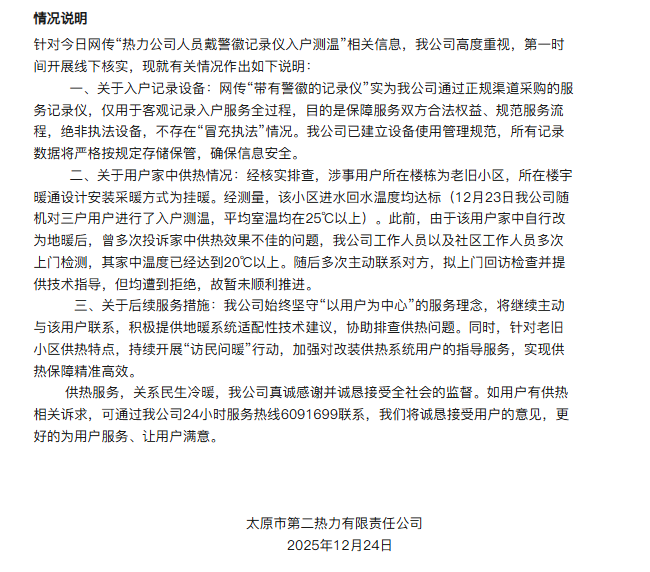 针对今日网传“热力公司人员戴警徽记录仪入户测温”相关信息,太原市第二热力有限责任公司第一时间开展线下核实,现就有关情况作出如下说明: