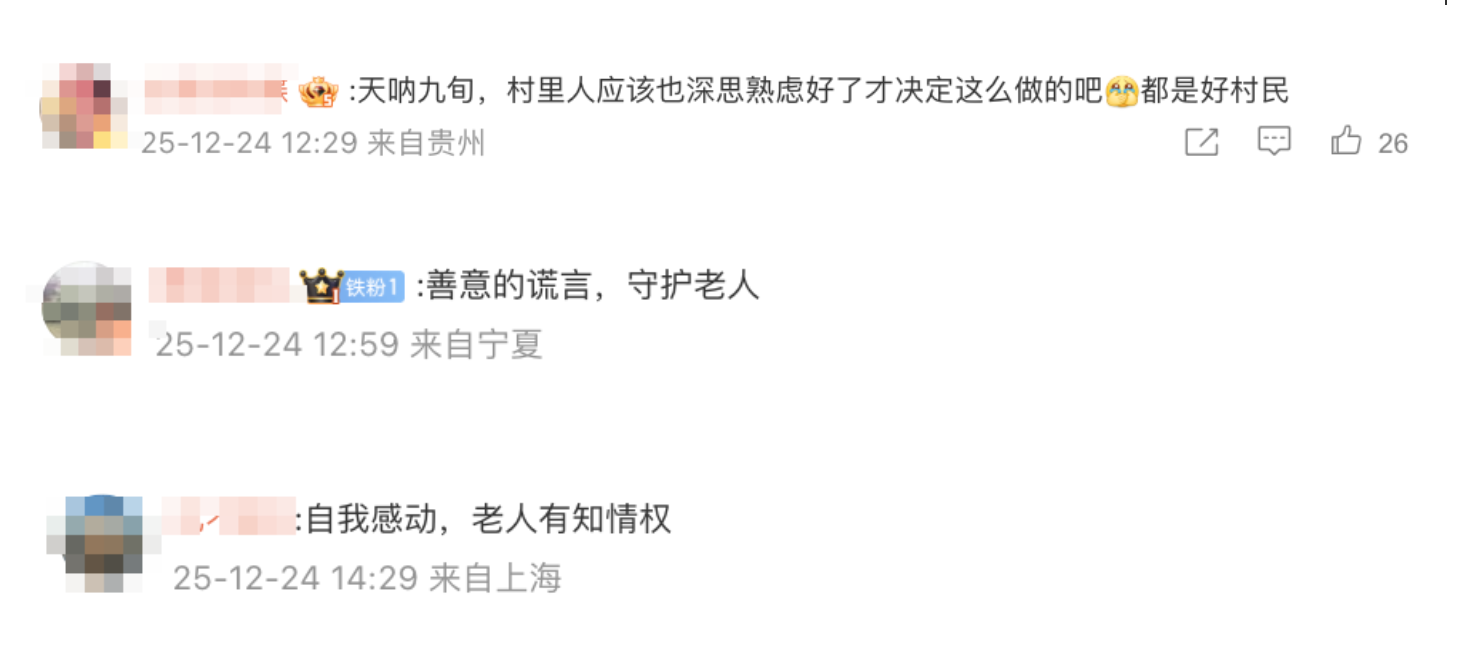 不少网友对此感到悲伤。对于这样的隐瞒选择,有网友认为“这是善意的谎言”,是“守护老人”的办法。