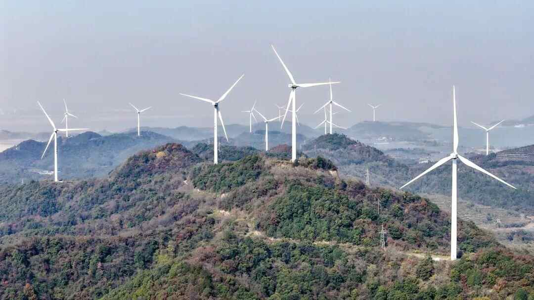 12月3日,在江西九江市湖口县舜德乡高桥村,风力发电机组矗立青山间,不断输送绿色清洁能源。张玉摄
