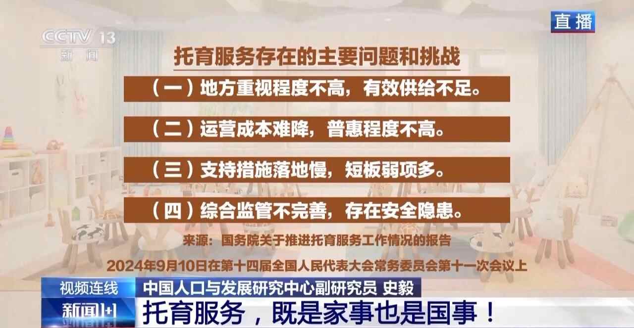 中国人口与发展研究中心副研究员 史毅:托育服务价格过高一直是最近几年这个行业发展,大家普遍关注的一个问题。根据我们在全国包括不同地方的调查,我们可以看到全国的托育服务的平均价格大概占到我们居民人均可支配收入的大概50%到60%,这样的一个比例就意味着一个家庭里面,一个人他的收入仅仅能够负担一个孩子整个送托的成本,如果他家里面有两个或者两个以上的孩子,那么他的养育的压力就会变得比较大。