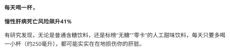 每天每增加一份人工甜味剂饮料(250 毫升)脂肪肝风险增加15%、严重肝病风险增加14%、慢性肝病死亡风险增加41%。
