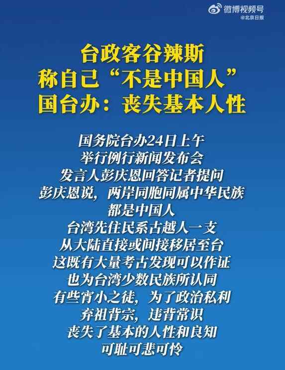 记者问,台湾地区领导人办公室前发言人谷辣斯,近日在其新书发表会上称,自己“不是中国人”,世界上没有一个民族叫“中华民族”;并称台湾面临“大陆威胁”,除了要具备军备、能源韧性,身份认同也是“国安议题”。对此有何评论?