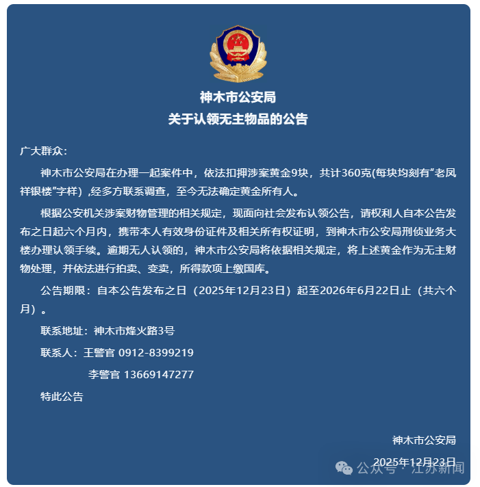 12月23日,陕西省神木市公安局发布“关于认领无主物品的公告”,具体内容如下——