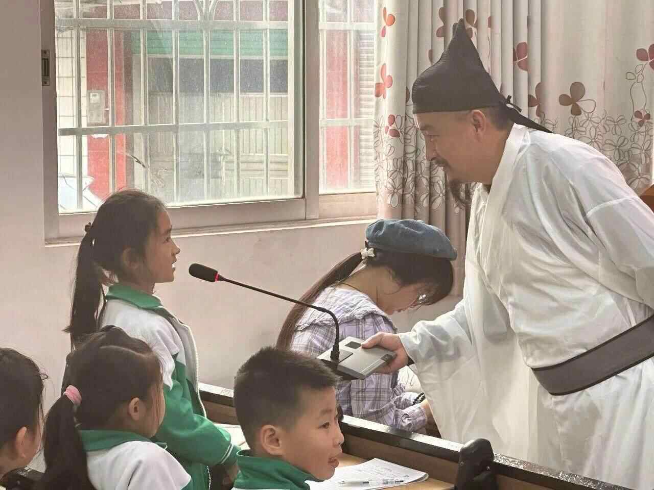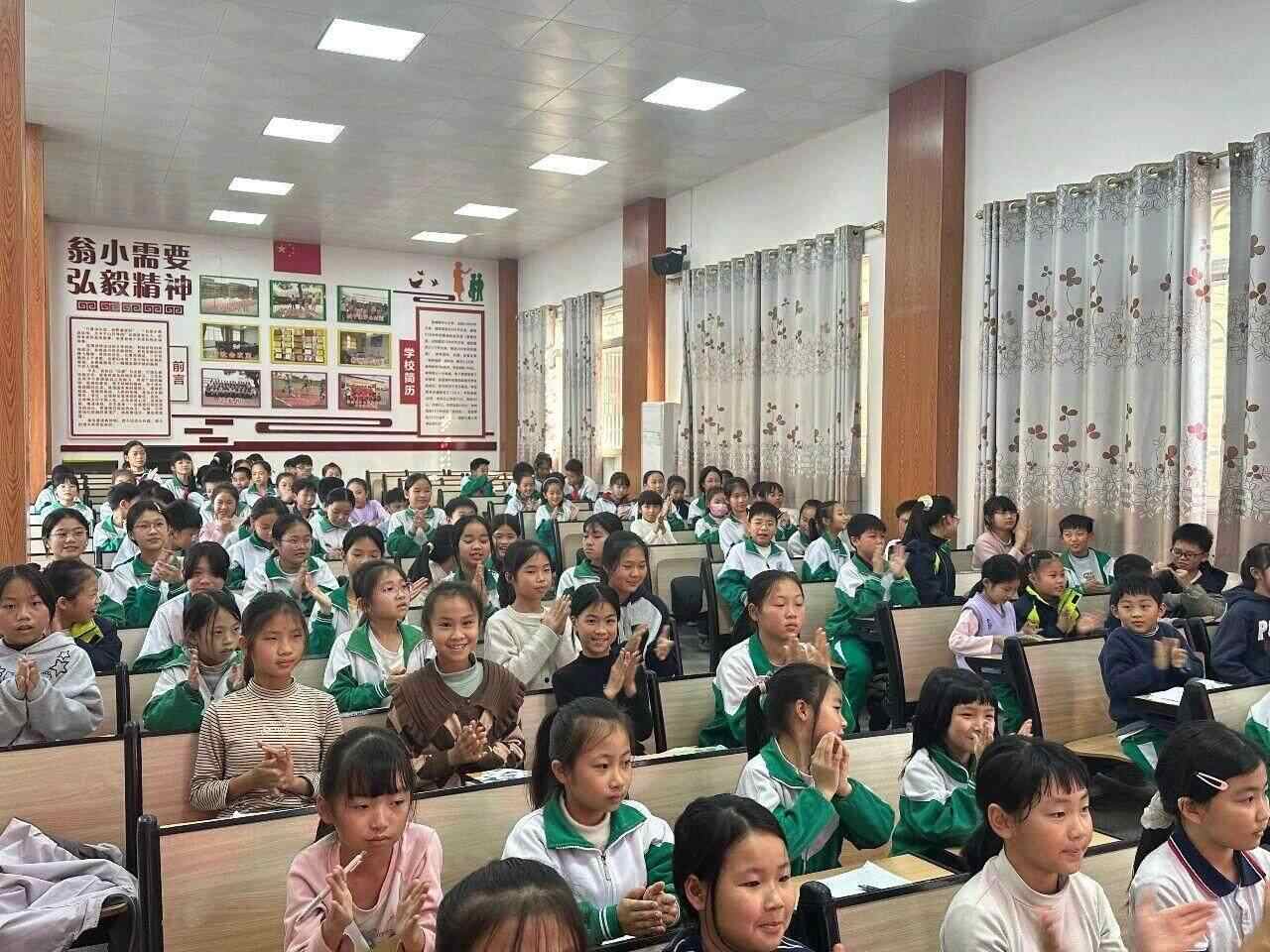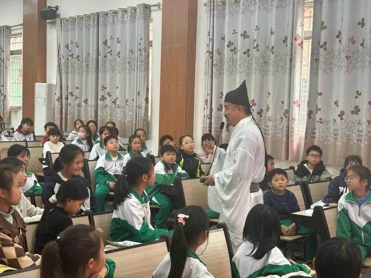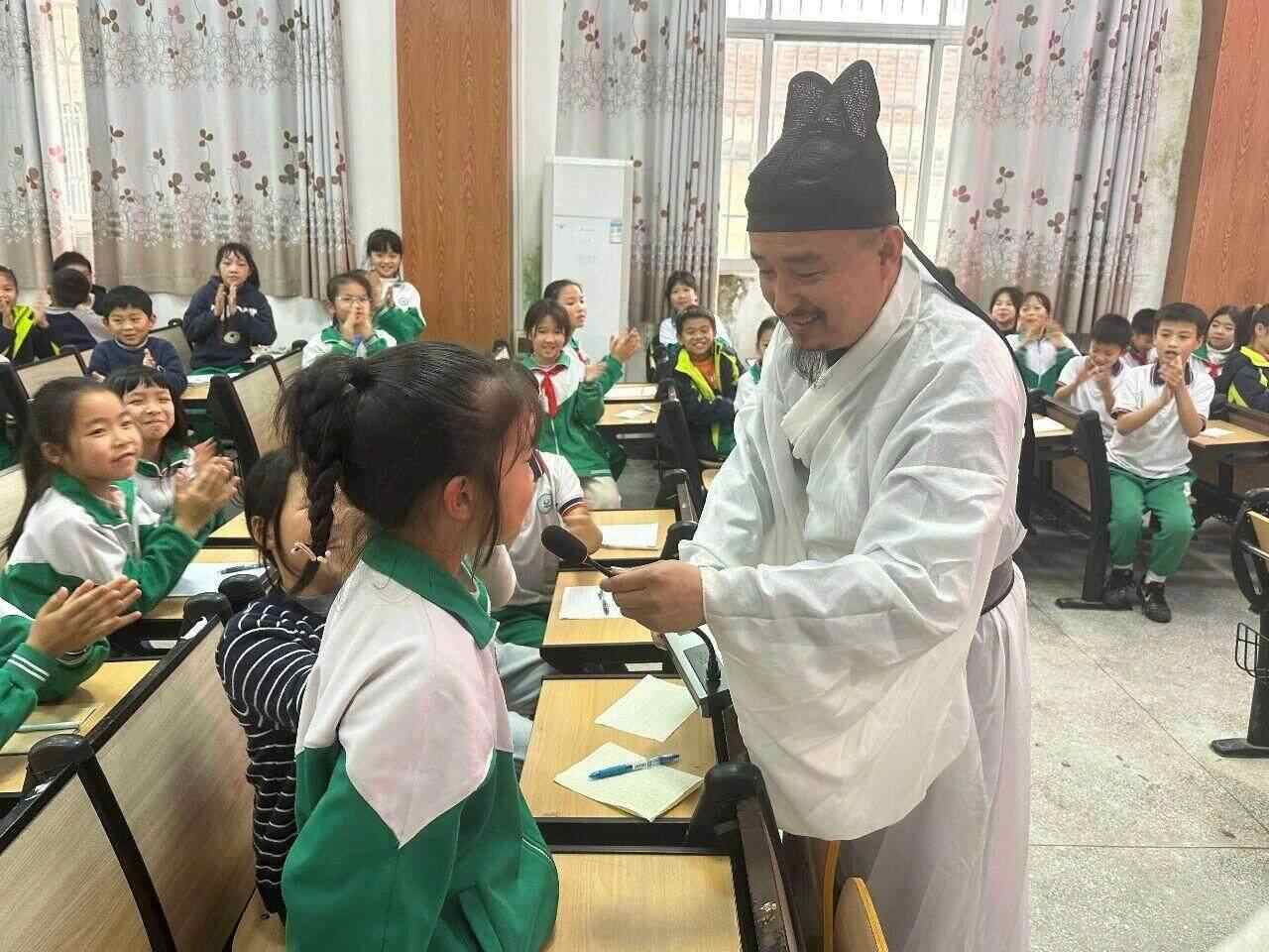 而后,“翁城李白”朱海文老师的登场,将这份热忱引向了古诗的江河。他与孩子们聊诗,更带领大家齐声背诵李白的诗句。一时间,礼堂内诵读之声朗朗响起,古典的韵律与现场的朝气相互激荡,将诗会的氛围推至温暖的高潮。