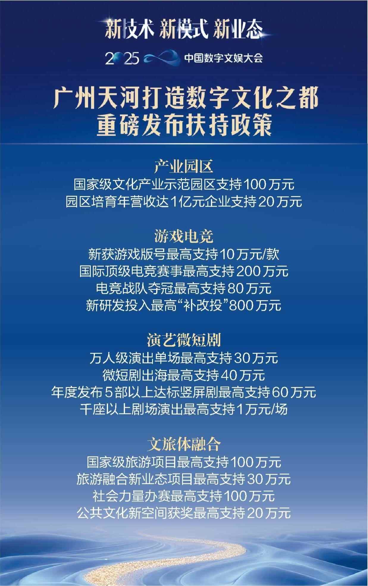 12月18日,在2025年中国数字文娱大会上,作为全国数字文化产业核心集聚区的广州市天河区,发布了促进数字文化产业高质量发展的政策措施,包括《广州市天河区促进文化产业园区和游戏电竞产业高质量发展的若干政策措施》《广州市天河区促进文旅体产业高质量发展的若干政策措施》。天河区计划通过精准扶持,推动数字技术与文化产业深度融合、创新发展。