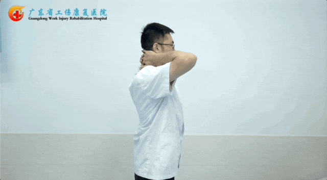 站直,双手交叉扶住颈部,手臂抬到与肩膀同一水平线上。