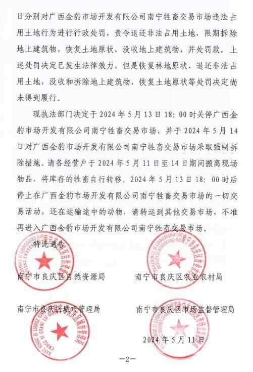 该《通告》称,执法部门决定于2024年5月13日18:00关停广西金豹市场开发有限公司南宁牲畜交易市场,并于2024年5月14日对广西金豹市场开发有限公司南宁牲畜交易市场采取强制拆除措施。《通告》由南宁市良庆区自然资源局、南宁市良庆区农业农村局、南宁市良庆区城市管理局、南宁市良庆区市场监督管理局联合发布。
