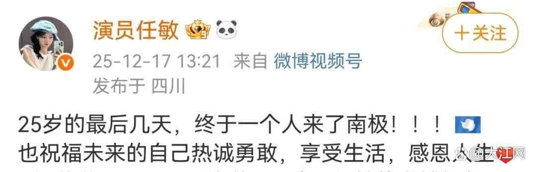 12月17日,女演员任敏在社交平台晒出一段南极旅游视频,并配文:“25岁的最后几天,终于一个人来了南极!也祝福未来的自己热诚勇敢,享受生活,感恩人生。”