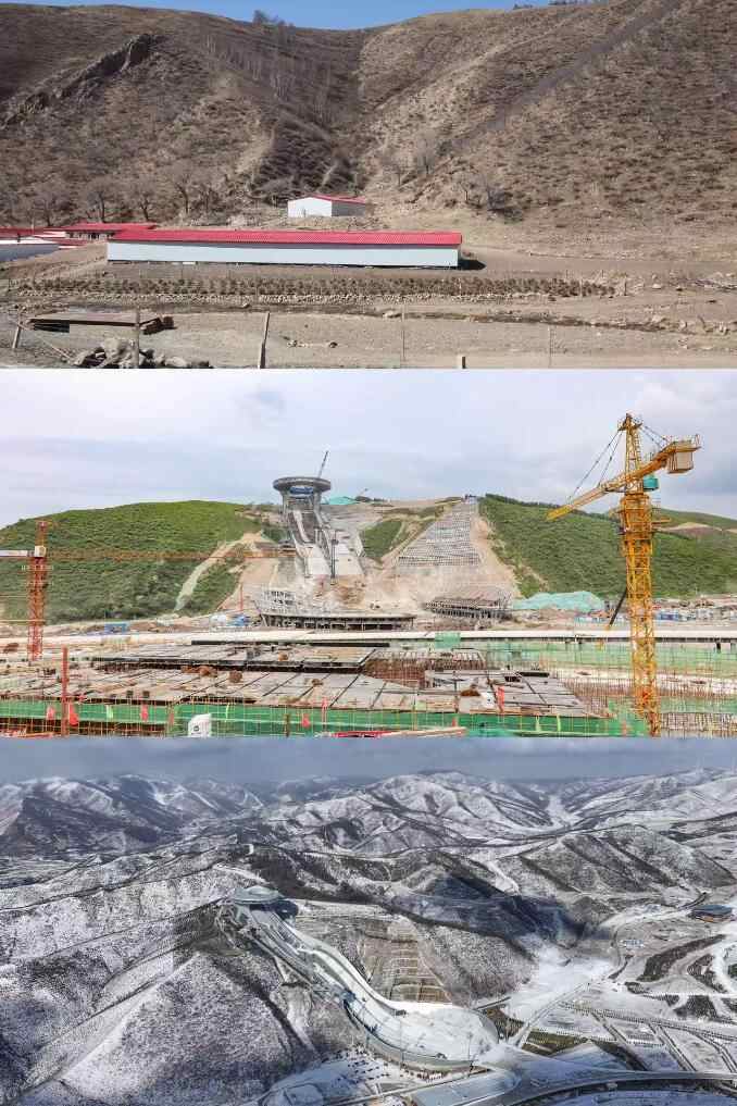 上:2015年3月21日拍摄的张家口市崇礼区古杨树(现在国家跳台滑雪中心)。中:2020年7月16日,建设中的国家跳台滑雪中心。下:建成后的国家跳台滑雪中心。图片均由武殿森拍摄