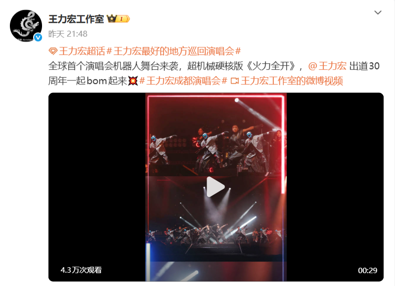 随后@王力宏工作室 发文认证“全球首个演唱会机器人舞台来袭”。