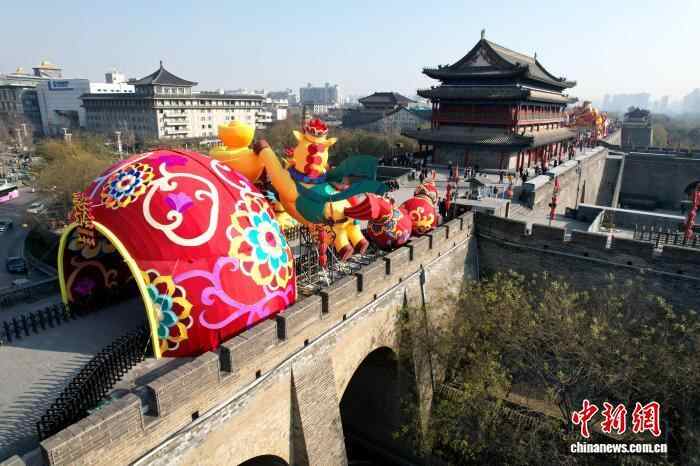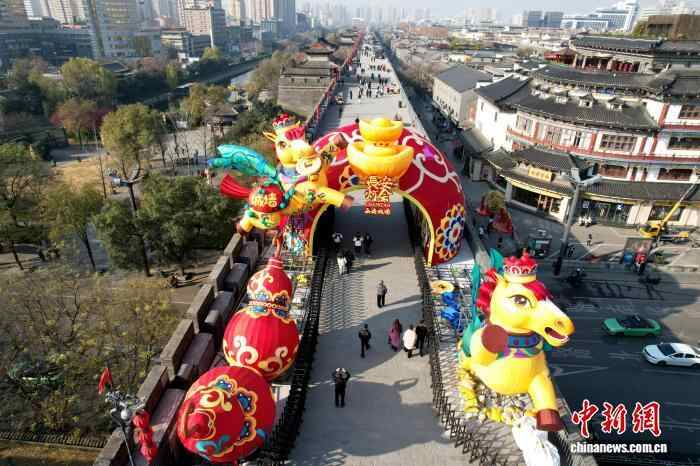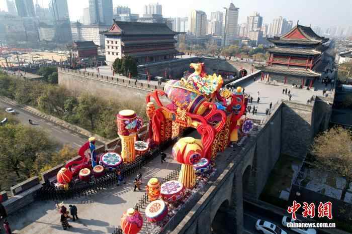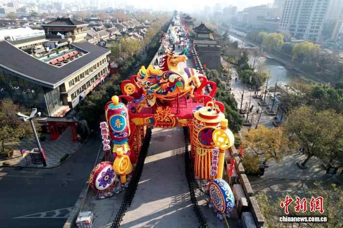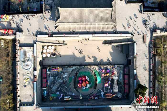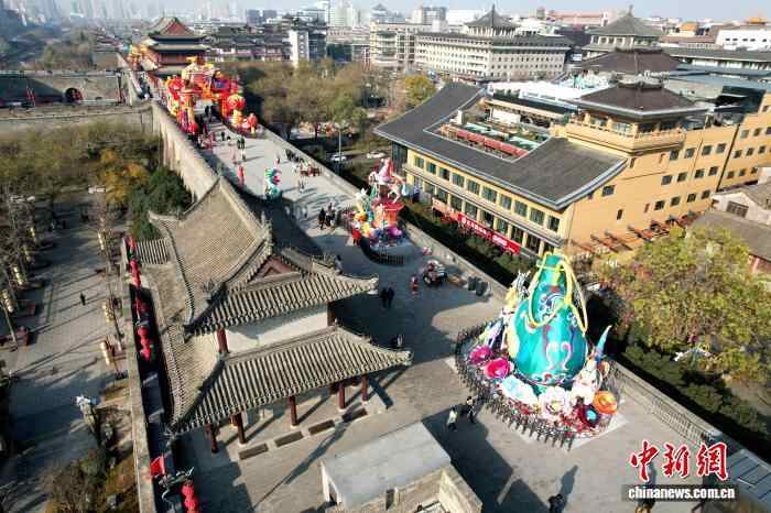 12月17日,陕西西安,2026年西安城墙灯会筹备工作有序进行中。图为南门瓮城内正在架设灯组。(无人机照片)中新社记者 张远 摄
