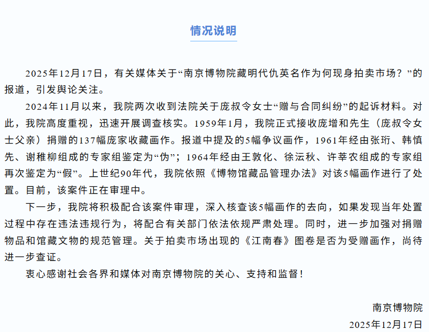 2025年12月17日,有关媒体关于“南京博物院藏明代仇英名作为何现身拍卖市场?”的报道,引发舆论关注。