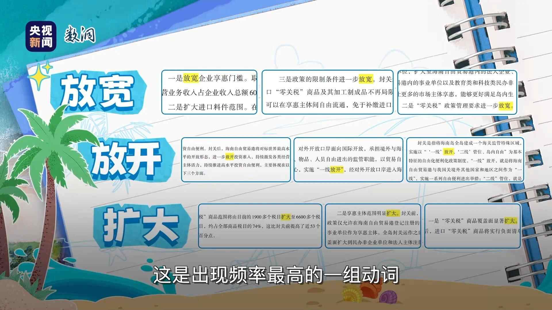 第一类动词是“放”:放宽、放开、扩大等,这是出现频率最高的一组动词。封关以后,海南不是“关”,而是把制度空间放开了:“‘零关税’政策管理要求进一步放宽”“放宽市场准入”等等,对于想来海南工作、创业的人,这就是第一层机会。