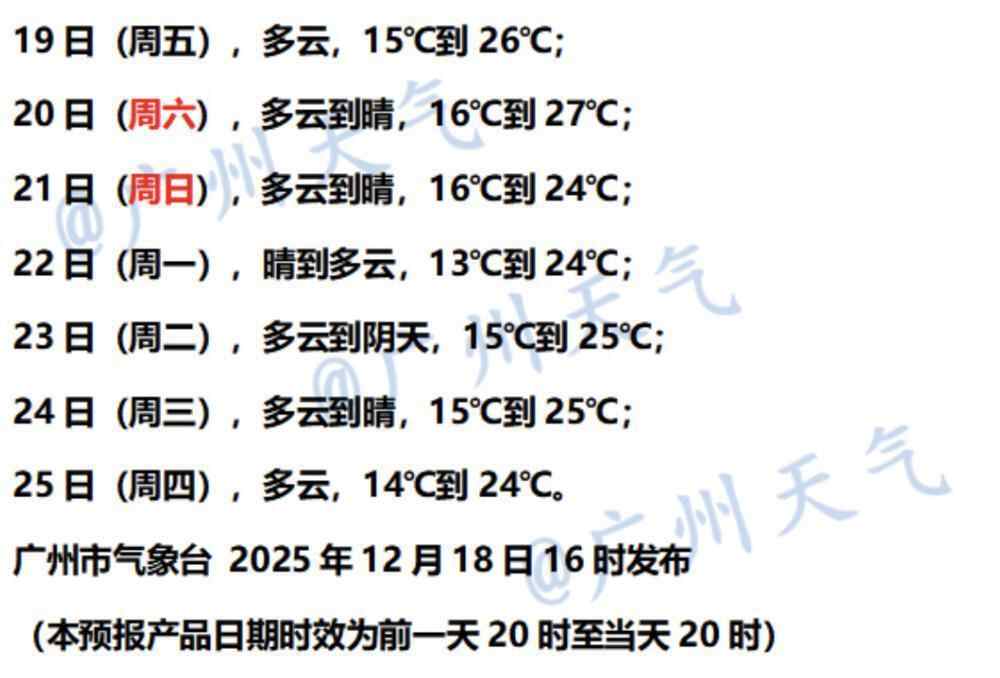 广州市气象台预计,19日至20日受南支槽影响,广州云量略有增多。预计21日至25日,受到冷空气补充影响,广州多云到晴,气温有所下降,其中21日广州马拉松比赛当天,气温将从20日的16~27℃,小幅下降至16~24℃,22日则进一步下降至13~24℃。按现有气象资料预计,21日广州马拉松比赛期间,广州市区气温将介于17~23℃。