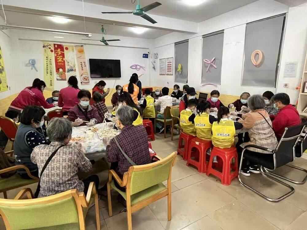 在活动的手工包饺子体验中,“宝贝志愿者”们围坐在长者身旁,一边仔细聆听关于冬至“团圆纳福”的传统寓意,一边认真模仿长者们的手法学习包饺子。长者们耐心细致地手把手指导,在传授技巧的同时,也将冬至节日蕴含的家庭观念娓娓道来。