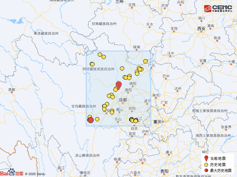 历史地震:根据中国地震台网速报目录,震中周边200公里内近5年来发生3级以上地震共118次,最大地震是2022年9月5日在四川甘孜州泸定县发生的6.8级地震(距离本次震中259公里),按震级大小前50次历史地震分布如图。