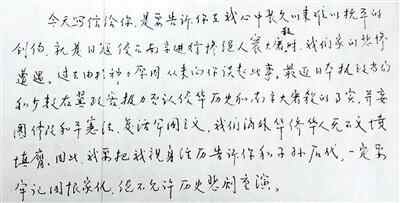 今天写信给你,是要告诉你在我心中长久以来难以抚平的创伤,就是日寇侵占南京进行惨绝人寰大屠杀时,我们家的悲惨遭遇。过去由于种种原因从未向你谈起此事,最近日本执政当局和少数右翼政客极力否认侵华历史和南京大屠杀的事实,并妄图修改和平宪法,复活军国主义,我们海外华侨华人无不义愤填膺。因此,我要把我亲身经历告诉你和子孙后代,一定要牢记国恨家仇,绝不允许历史悲剧重演。