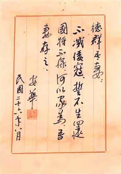 8月10日晚,易安华率部开赴上海,并派副官送给妻子这封仅20字的家书,以诀别的口吻写下“告妻儿书”。