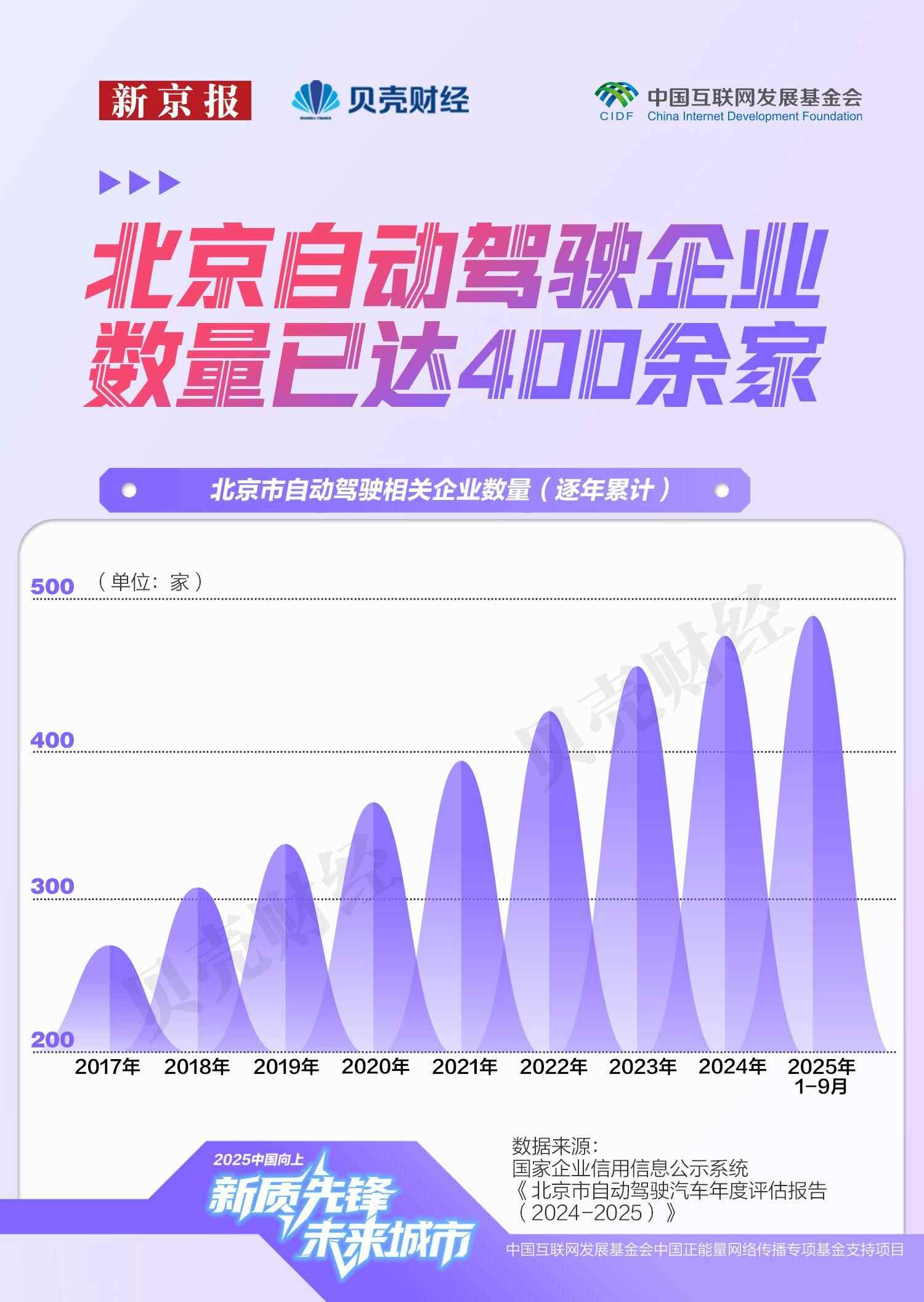 伴随产业政策持续发力和测试场景不断开放,2017年以来,北京自动驾驶相关企业年均新增超过20家,小微企业占比超过六成。截至2025年9月,北京已累计拥有400余家企业,初步形成覆盖“车、路、云、网、图、测、运”全链条的产业生态。