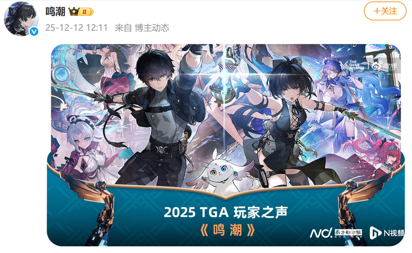 值得一提的是,由广州库洛游戏研发并发行的开放世界动作游戏《鸣潮》斩获了“玩家之声”奖项。这是继《黑神话:悟空》后又一中国游戏获得该奖,也是今年TGA唯一获奖的国产游戏。