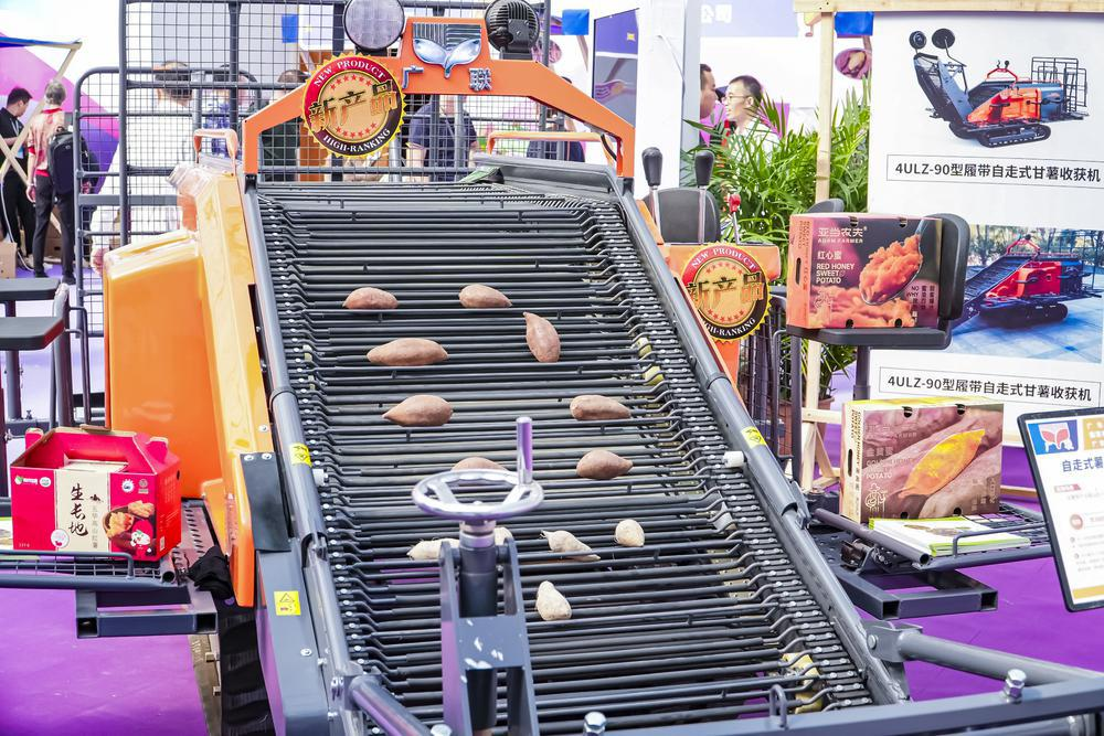 薯业大会上,金黄饱满的广东薯香气四溢,甘薯绿植创意盆栽造型别致,农机区机器演示引人驻足探究。