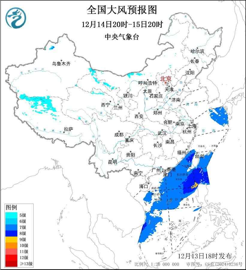 12月14日20时至15日20时,内蒙古中部、西藏北部等地部分地区有5~6级风,阵风7~8级;台湾海峡、台湾以东洋面、巴士海峡、南海东北部和中部海域、南海西南部海域将有7~8级、阵风9级的大风,东海东北部海域将有7级、阵风8级的西北风。