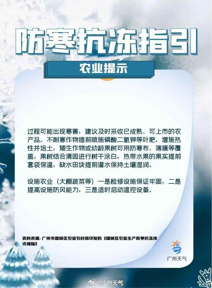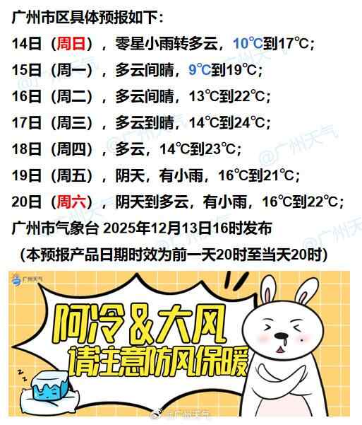 预计,14日降雨减弱,气温仍低,最低气温将出现在14日或15日早晨:粤北和珠三角北部市县3~7℃,部分市县有5℃以下的低温天气,高海拔山区0℃左右,局部有霜(冰)冻,南部市县12~15℃,其余市县8~11℃;15日白天气温逐步回升。气温下降明显,注意适时添加衣物,粤北偏北市县注意防寒防冻。
