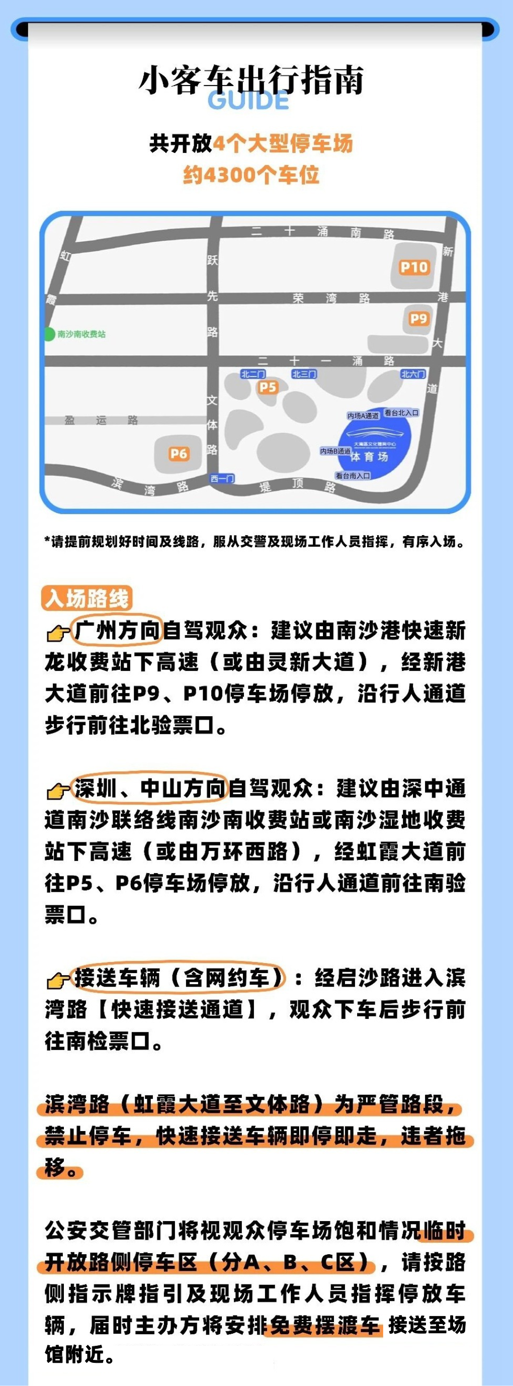 本次新增南沙联络线万顷沙东、西服务区作为停车区域,提供约2000个小车临停车位。服务区内部联络通道实施交通管制,仅允许西往东通行。广州方向车辆可停在西区或经内部通道停至东区,离场时通过东区匝道可直接上高速返回,无需前往中山掉头;深圳或中山方向车辆需停放在东区,离场时需北行至南沙湿地收费站下高速,经虹霞大道掉头后南行上高速。届时将在虹霞大道靠近停车区的位置设置接驳点,安排摆渡车接送观众至场馆。